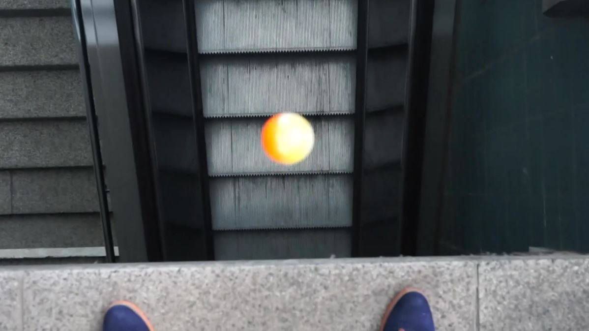 A small, neon-colored rubber ball gets accelerated by gravity. The long-awaited landing on the ground is withheld from the observer. The bouncy ball flies endlessly through ever-changing backdrops.