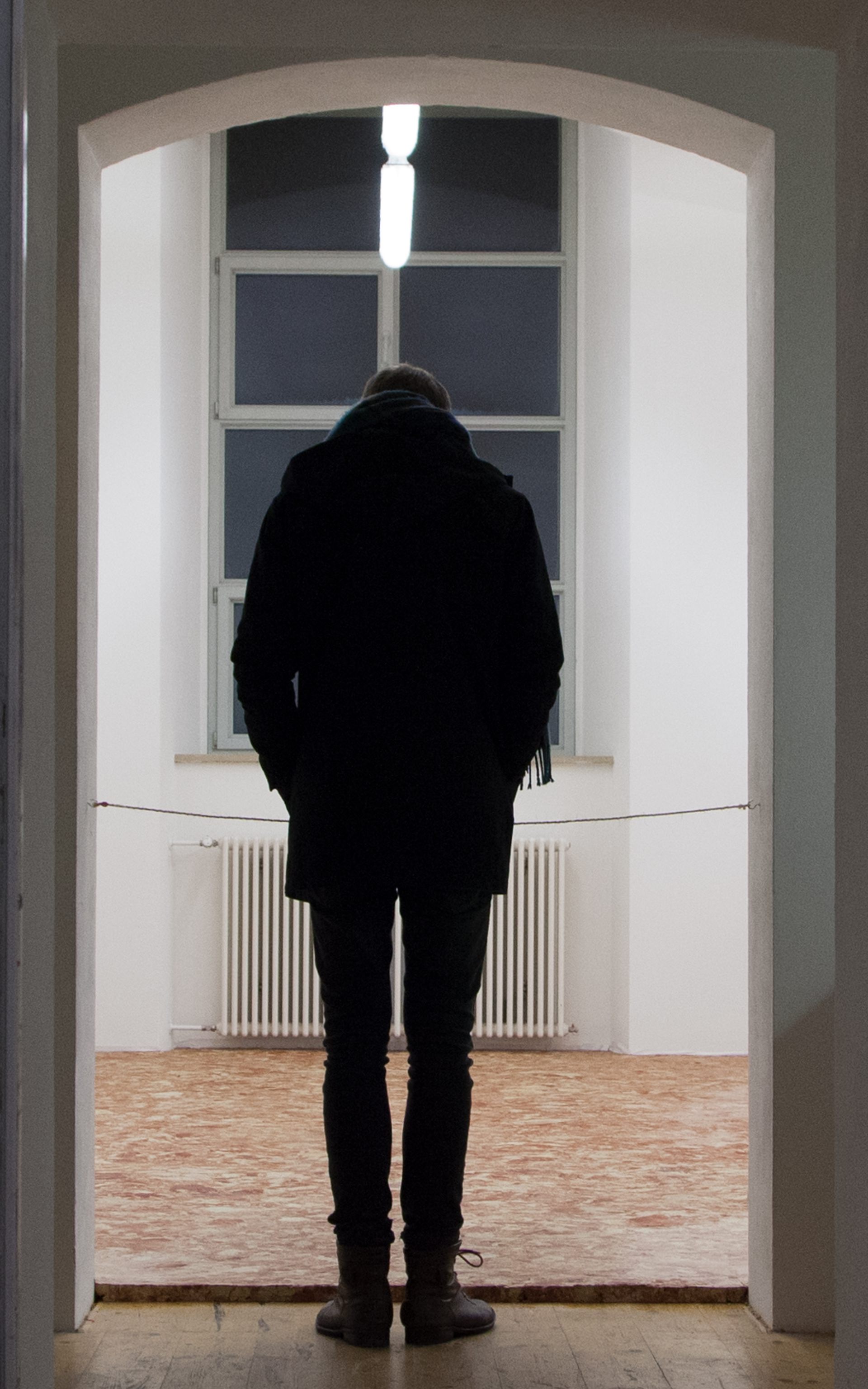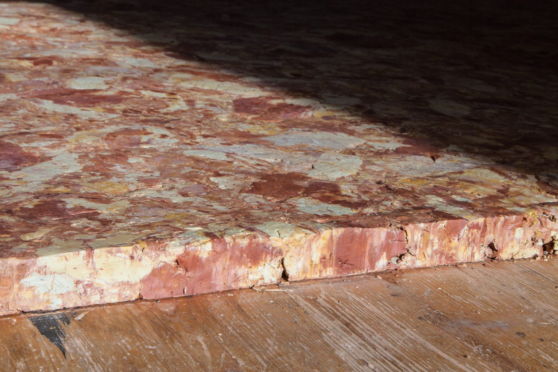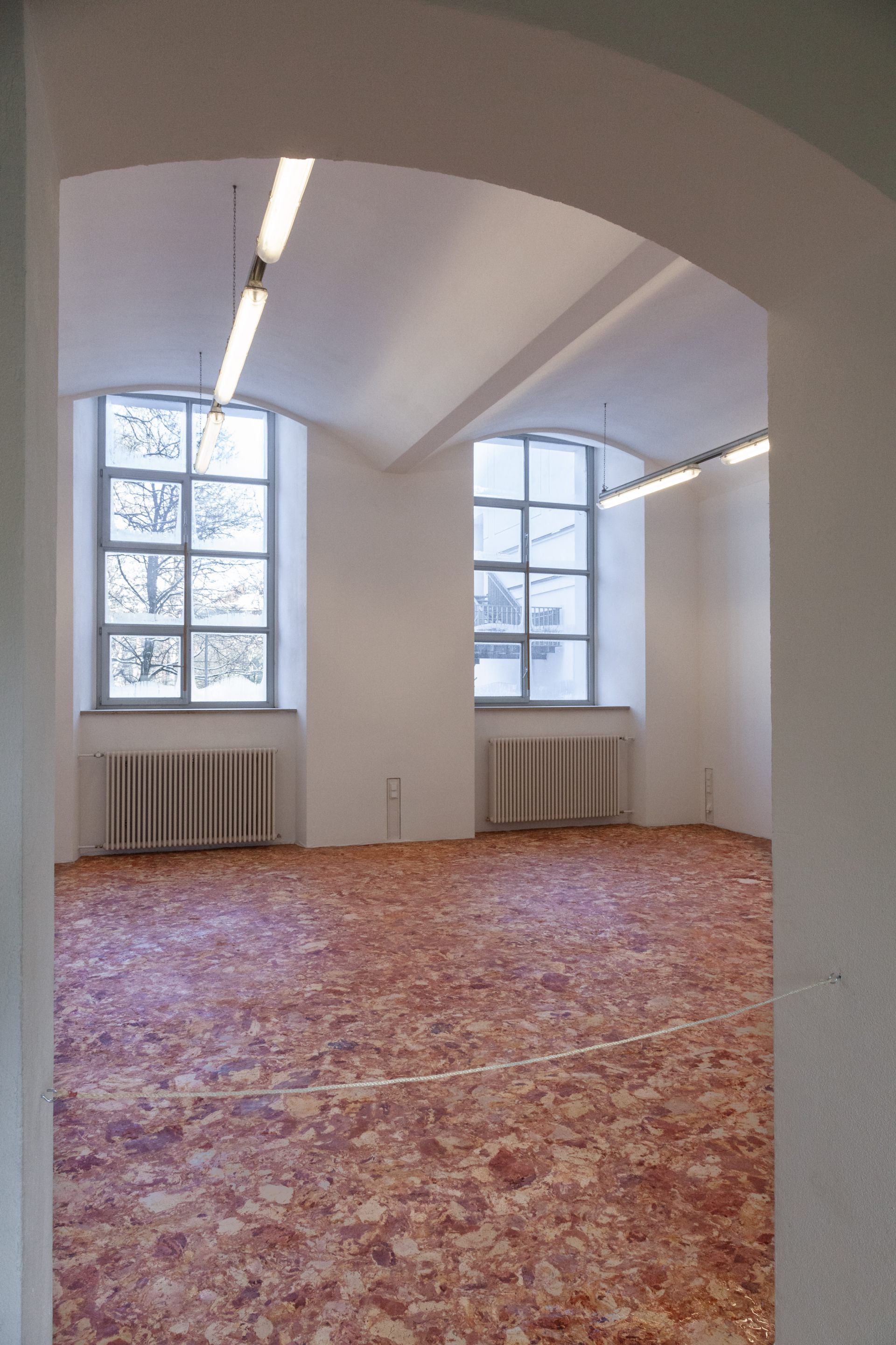 The floor of the exhibition space is covered with 3,5 metric tonnes of fresh, moist clay. The natural marbling of the thousand of years old material is clearly visible. Earth taken directly from the clay pit is given its new form through manual processing to form an overall surface. The viewer is denied access to the 50 square meter room and the material remains a secret. Associations with marble arise, while on the other hand, one experiences an organic, ephemeral impression, such as when looking at meat. Earthy, damp smells and the seamless processing of the inaccessible surface provide subtle clues to its actual materiality.
