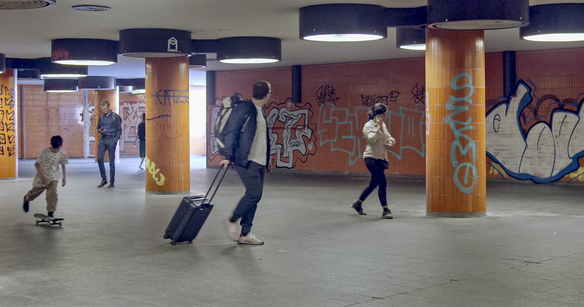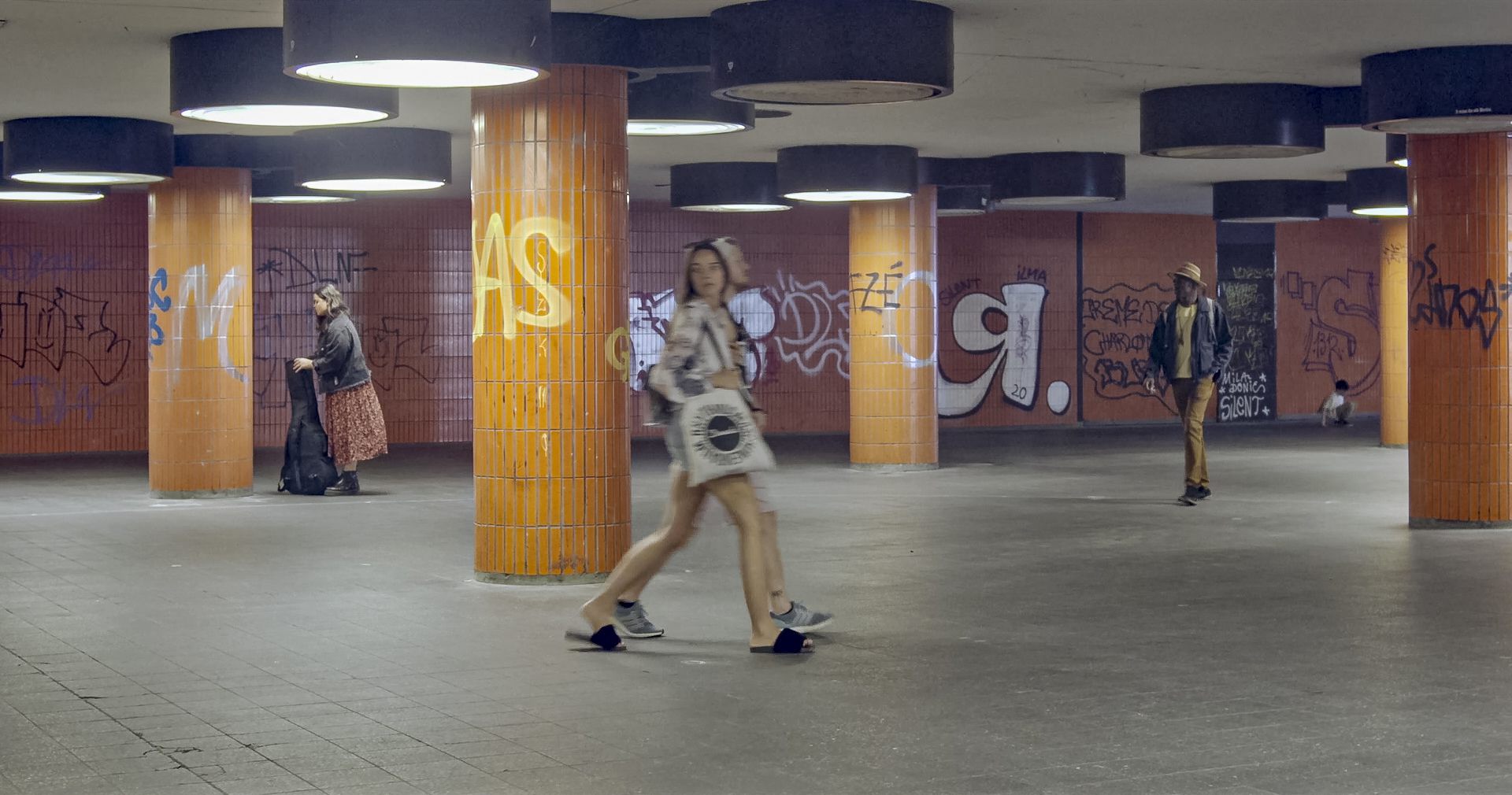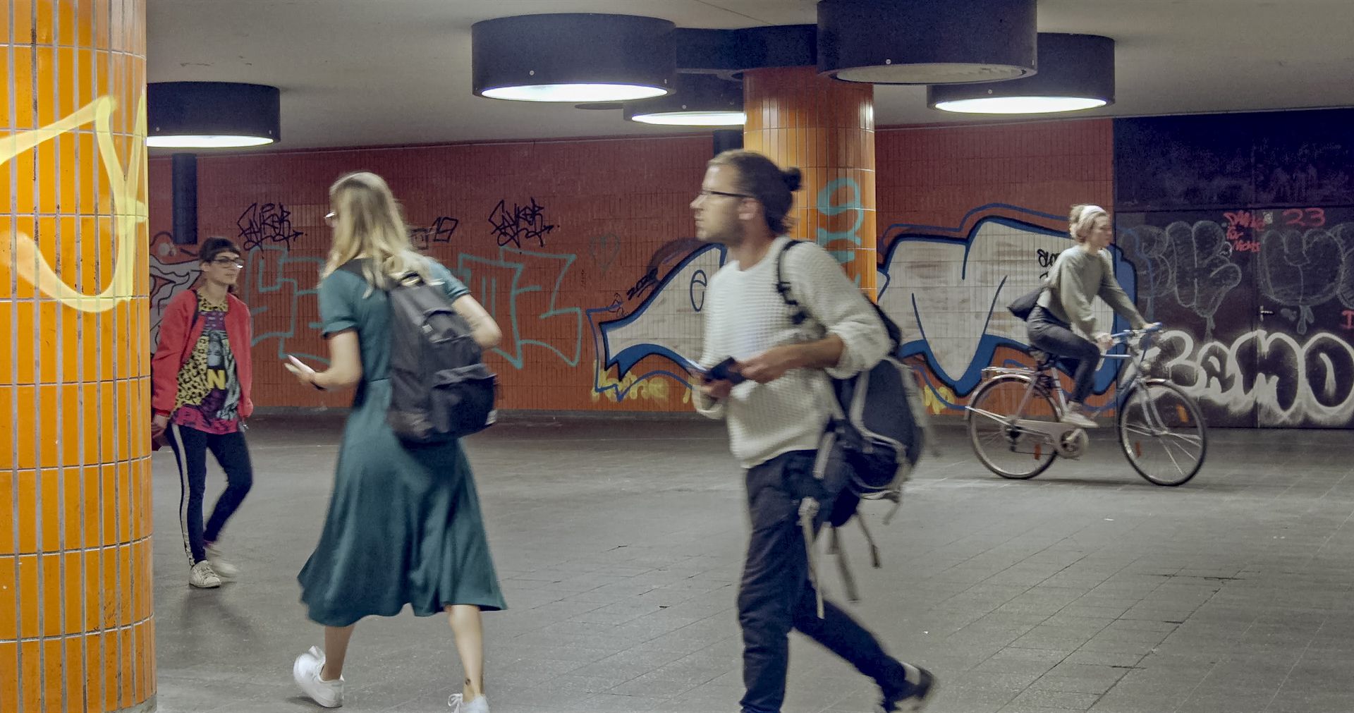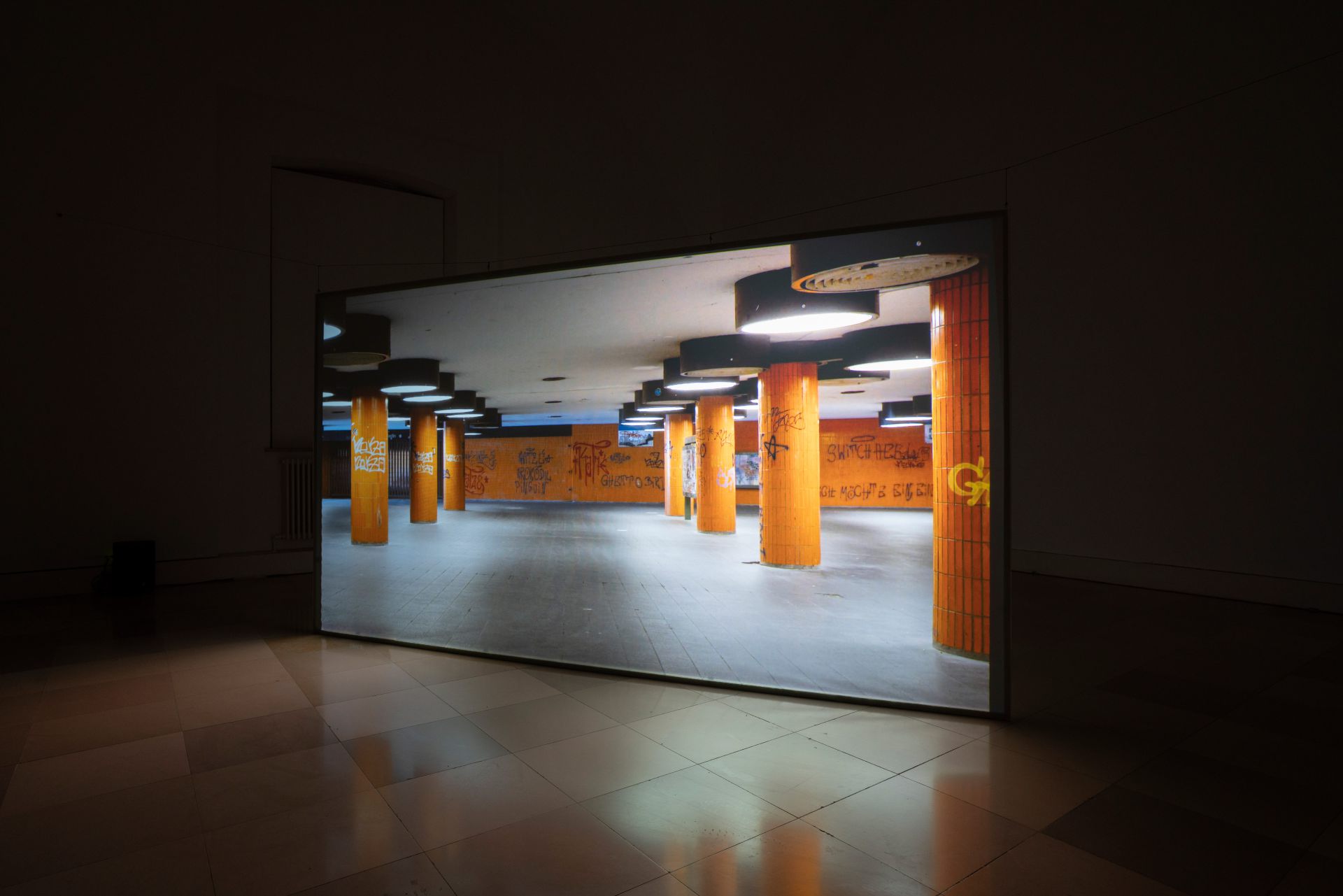 The video installation lets the viewer drive in endless circles around a seemingly everyday scene. The underpass under the street Messedamm at the International Convention Center Berlin is an everyday urban place bustling with people. They go about their daily business and traverse the picture, while the camera remains in constant motion as well, slowly and smoothly. As the camera moves, the people initially clearly visible in the picture are superimposed, as if by chance, by the architecture and suddenly all disappear at once. The camera continues, unimpressed, and the viewers are given time to observe the emptied and now silent scenery. With the continuous movement of the camera, the people are actually bound to appear again behind the architecture; this expectation, however, remains unfulfilled.