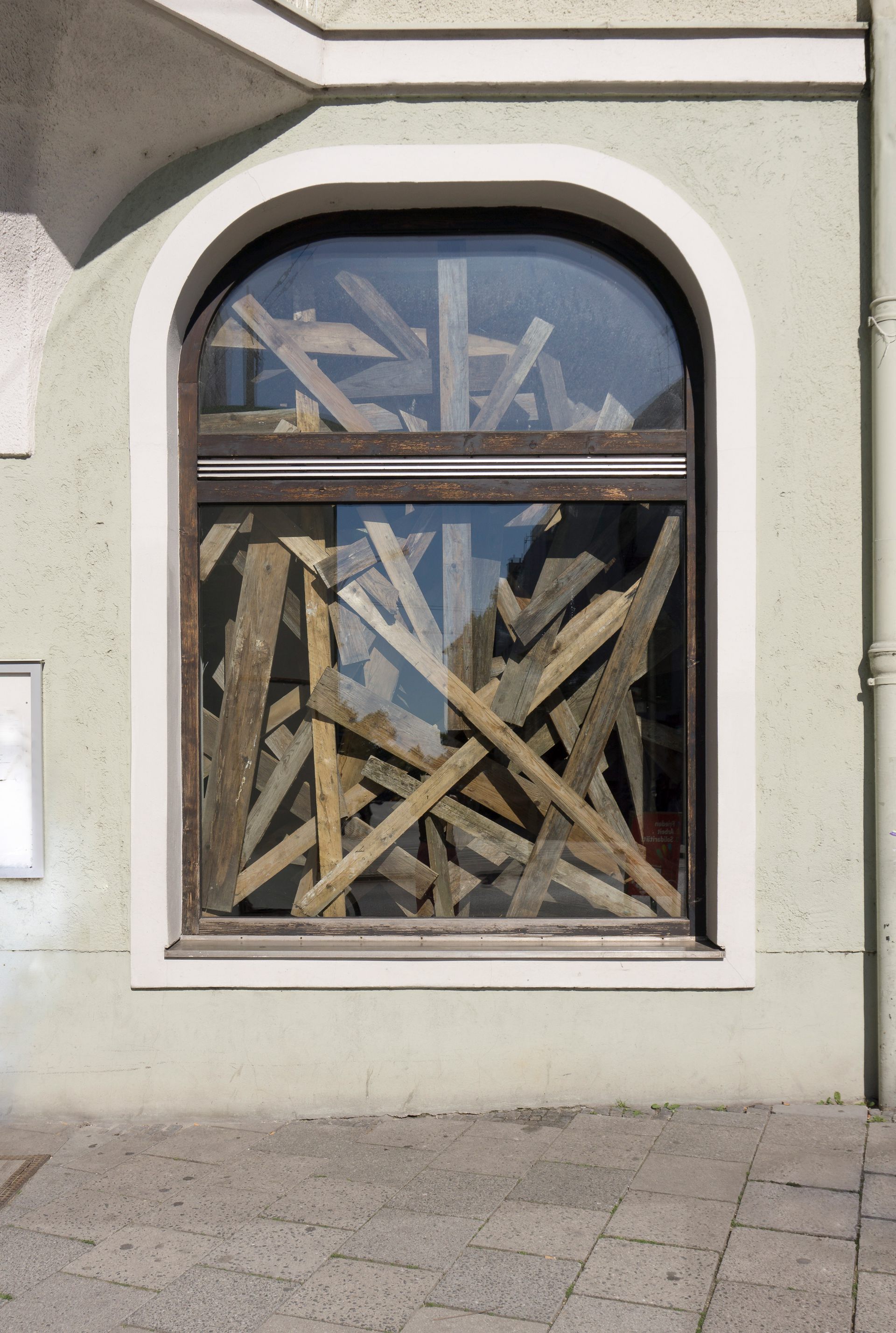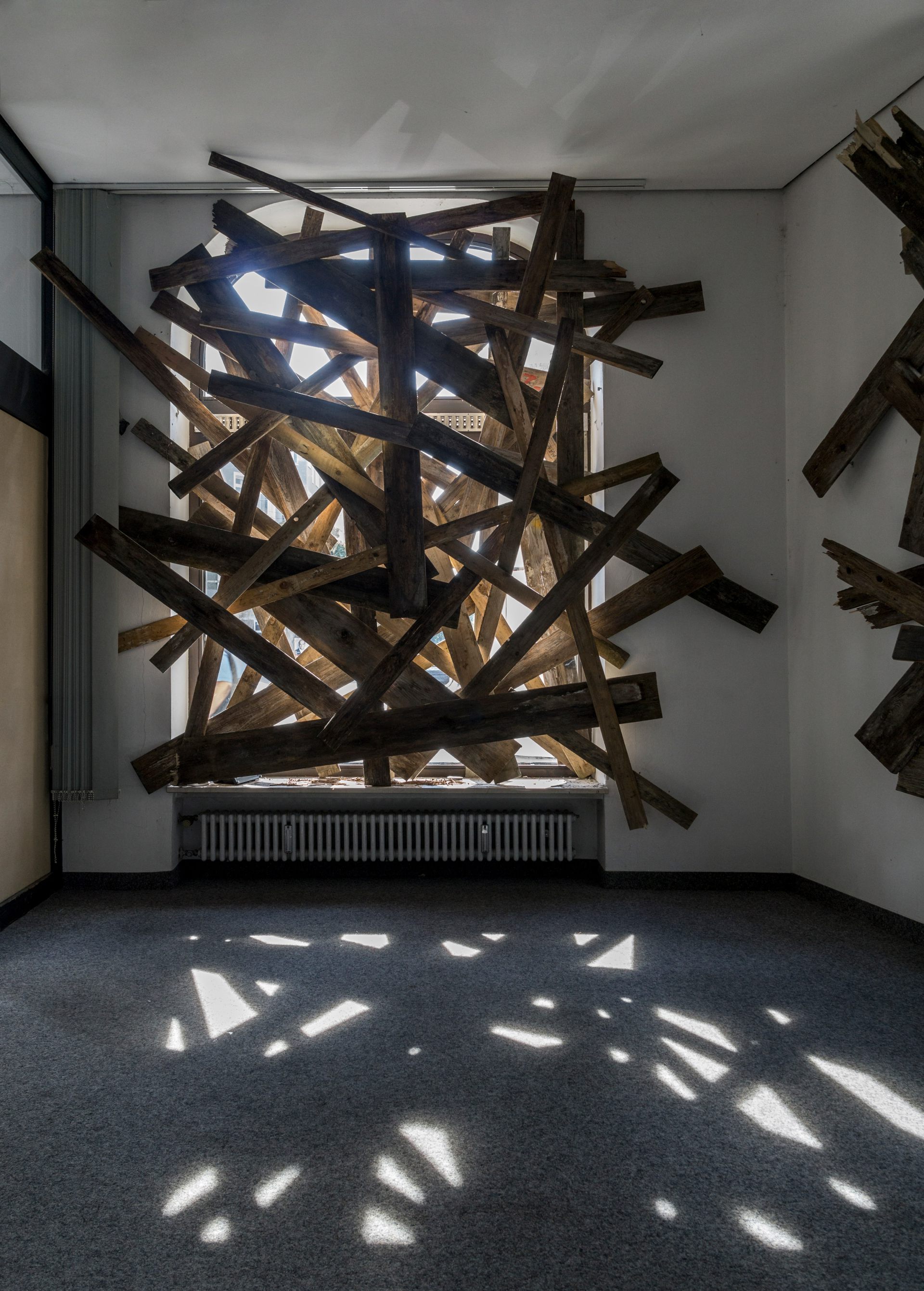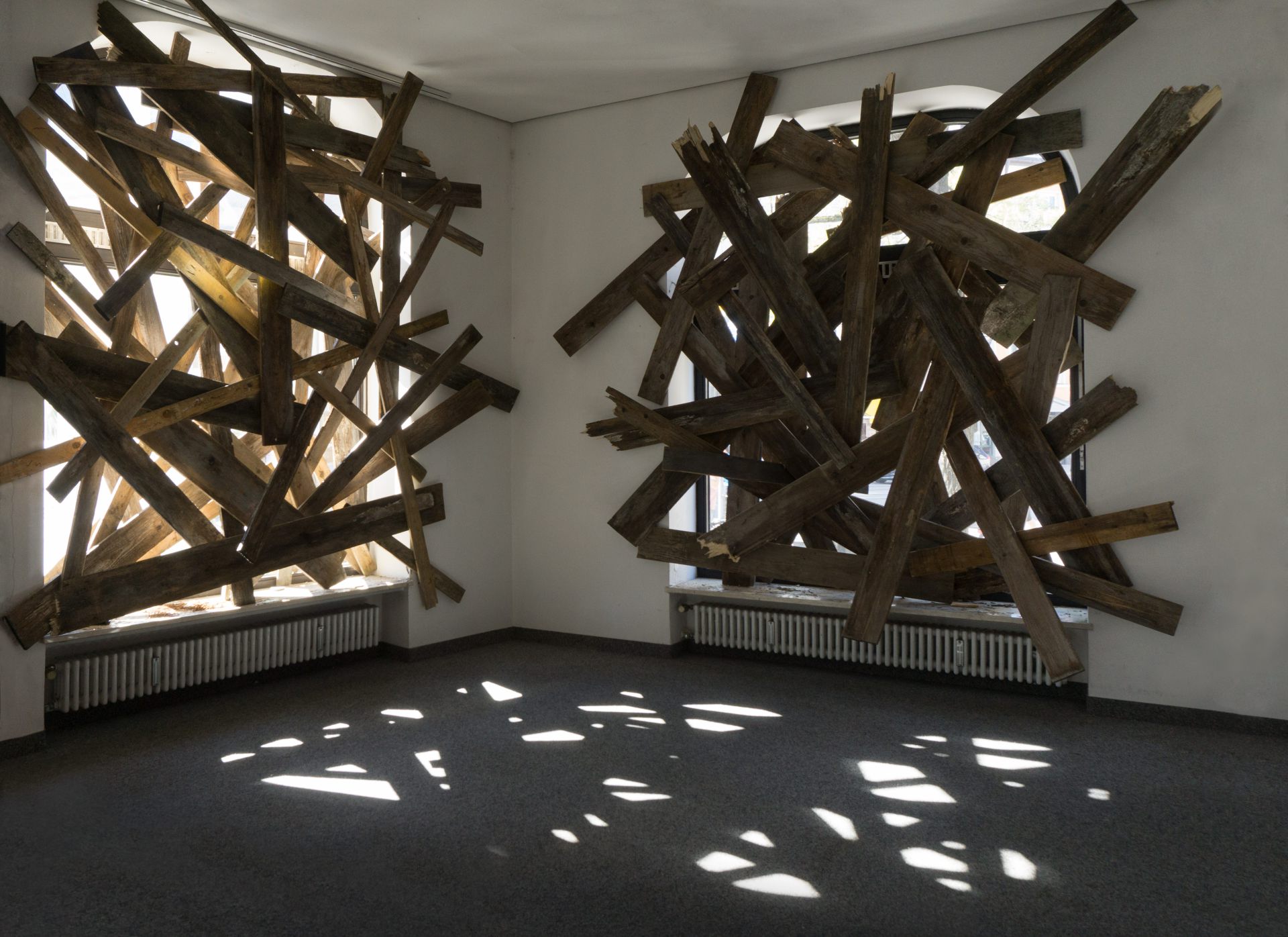 Fenster II Transitinstallation, wooden planks, nails, each window 210 × 280 cm, (exhibition view)