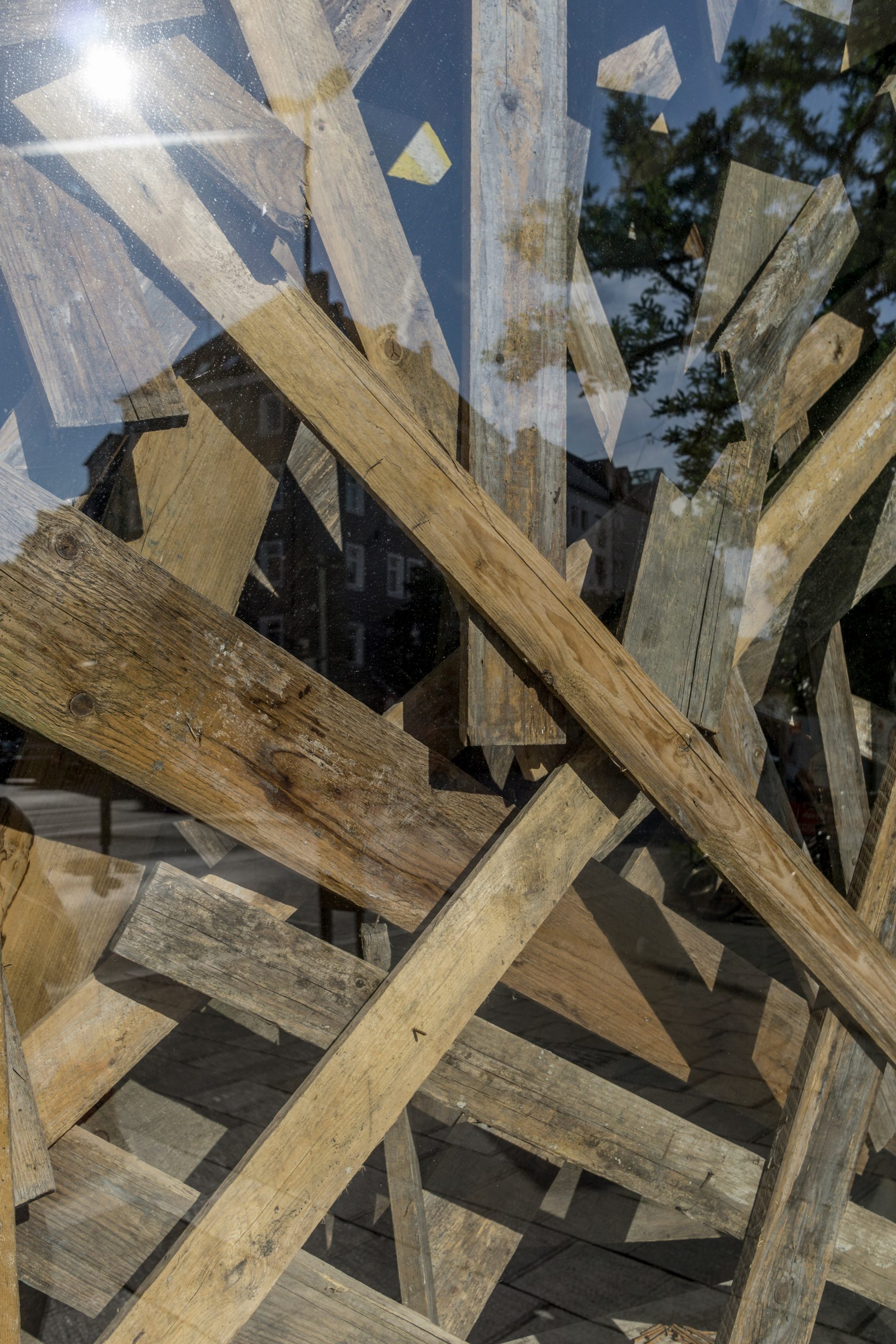 Fenster II Transitinstallation, wooden planks, nails, each window 210 × 280 cm, (detail)