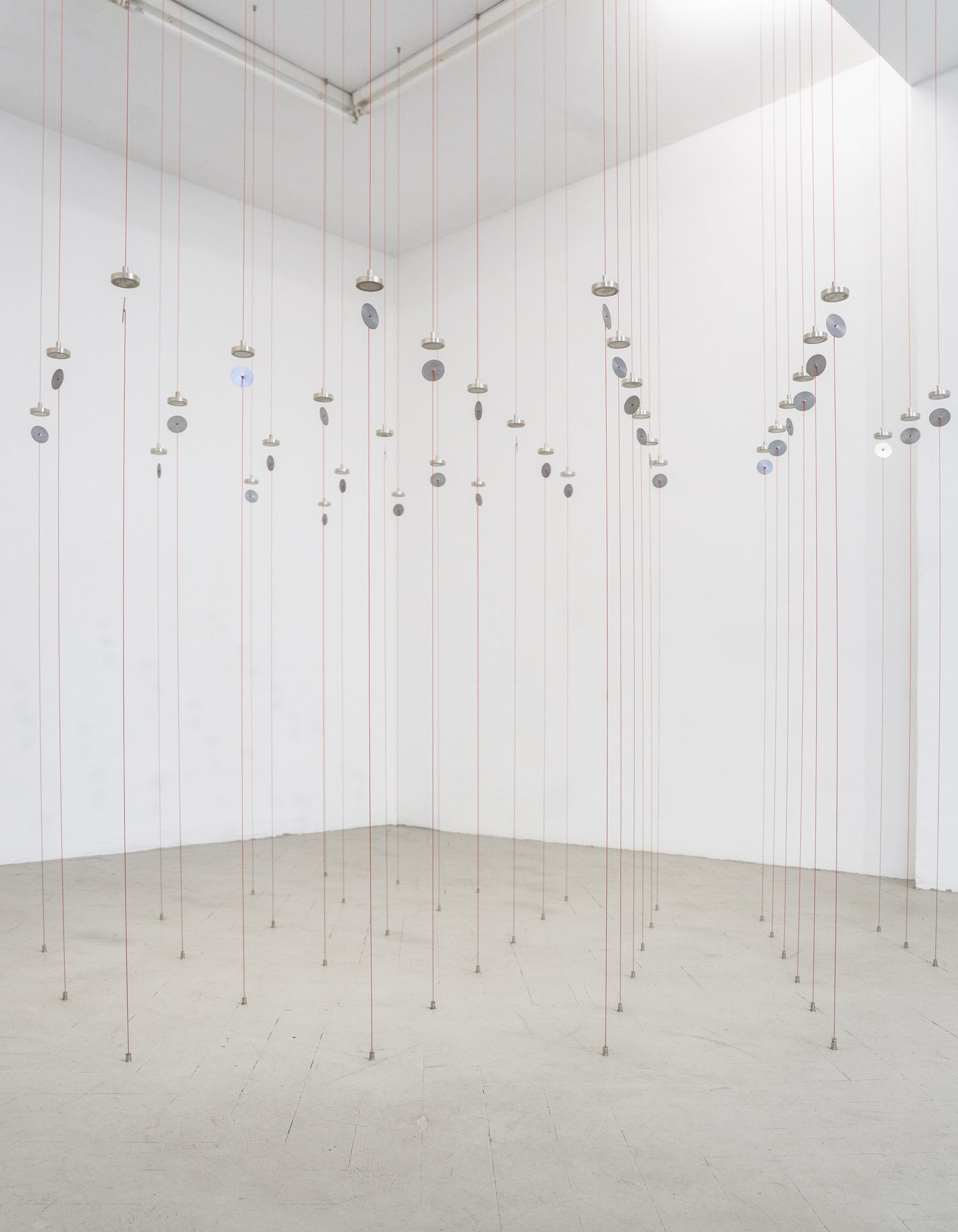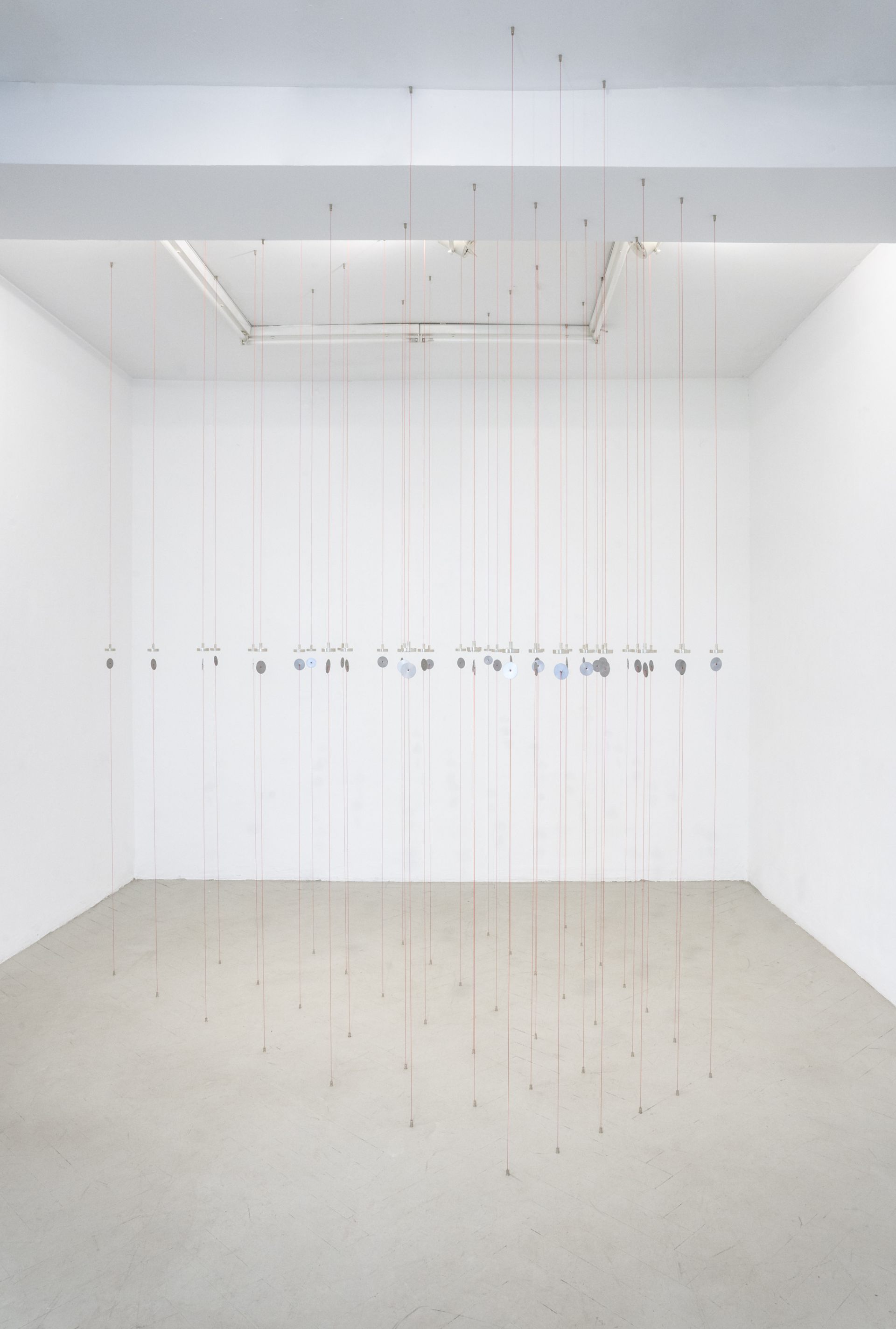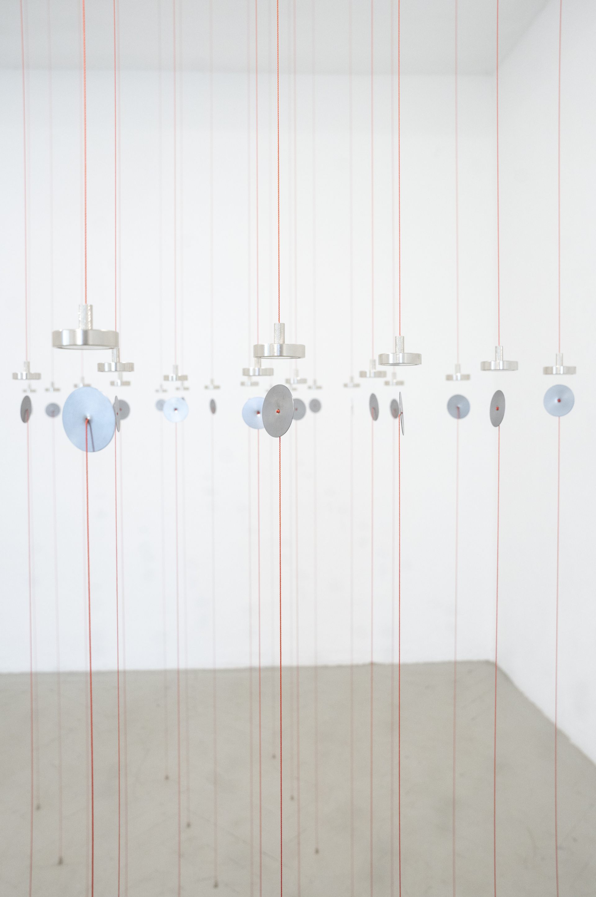 magnetic field with 42 powerful magnets in a grid of 6 × 7, metal, red string, dimensions variable, (exhibition view)