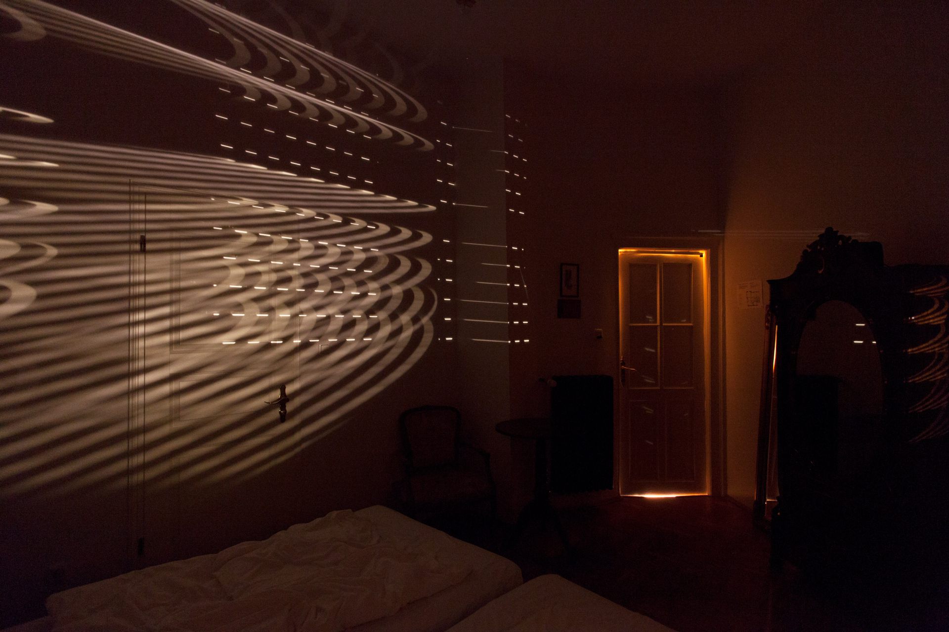 Zimmer 10installation, light incidence through blinds, lights, actuators, computer, loudspeaker, 7‘ loop, dimensions variable, (exhibition view)